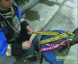 苗家花帶,織花帶,是苗家姑娘最盛行最喜愛的一種習(xí)俗。在苗家,從女兒長到七八歲起,母親就要叫他做針線活,待到十歲左右就交他學(xué)織花帶,如果母親技藝不高,還要請寨子里花帶技術(shù)最高的婦女來教。又得女孩子,從母親或姐姐那里初步學(xué)到織花帶技術(shù)后,就在本寨子邀同齡伙伴,三五個(gè)在一起,互相切磋技藝。待到編制技術(shù)日趨成熟后,姑娘也大了,就往往一個(gè)人躲在房中編制出色鮮艷的花帶,風(fēng)險(xiǎn)少女的情愛。苗家姑娘,往往拿自己編制的花帶作為禮品相贈,特別是姑娘有了意中人,就吧花帶作為愛情的信物相贈,以表示以身相許,愛情純貞。