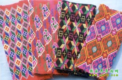 ![]() 織錦。又名“西蘭卡普”、“土花鋪蓋”,為土家族傳統(tǒng)工藝品之一,是森林公園工藝品廠的主要產(chǎn)品??楀\是在特制的本質(zhì)織機上以錦紗為經(jīng)、五彩絲線為緯、手工提花織成。以其質(zhì)地厚實、堅韌,色彩鮮艷,格調(diào)古樸,流暢生動著稱。圖案有花草、鳥獸、生產(chǎn)、生活、幾何、字樣等種類。為舊時土家姑娘必備嫁妝之一。據(jù)考證,早在漢代,土家織錦就作為方物貢入漢室宮廷。20世紀后,土家織錦曾漂洋過海至日、美、英等國展出,并作為禮品,被國家領導人贈送給外國元首及政府官員,如今織錦以壁掛、枕巾、沙發(fā)墊、桌圍、提袋、服飾等多種式樣遠銷世界各地。
