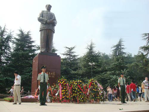 毛澤東銅像重3.7噸,像高6米,基座高4.1米,通高10.1米,象征著“10.1”國(guó)慶,更象征著毛澤東是新中國(guó)的締造者。像面朝東南方,身著中山裝,左胸前掛著“主席”證,手執(zhí)文稿,目光炯炯,面帶微笑,正視前方,巍然挺立,成功地再現(xiàn)了人民領(lǐng)袖毛澤東出席開國(guó)大典時(shí)的風(fēng)采。銅像褐紅色大理石基座正面,鐫刻著中共中央總書記、國(guó)家主席、中央軍委主席江澤民1992年題寫的“毛澤東同志”五個(gè)貼金大字。