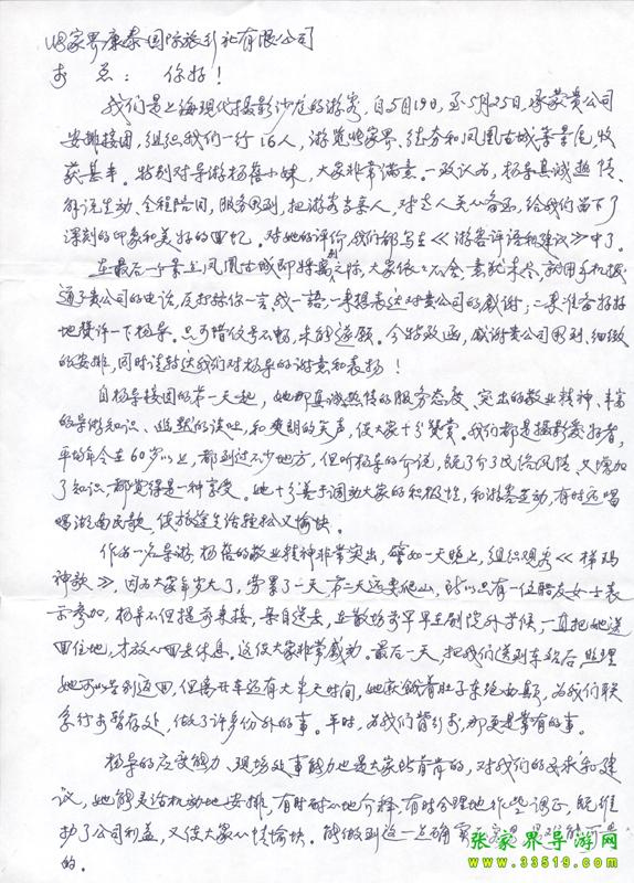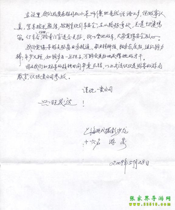 2009年5月19日“上?,F(xiàn)代攝影沙龍”一行16人,參加張家界旅游導游網(wǎng)組織的張家界旅游跟團,于2009年5月25日結(jié)束行程。游玩期間,由于導游楊蓓的出色講解和周到的服務,得到客人的一致好評??腿颂丶谋頁P信一封,如下: