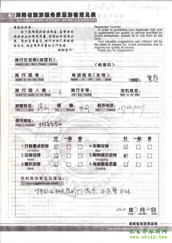 2010年7月20日吉林徐先生一行3位旅游質(zhì)量反饋:對(duì)導(dǎo)游十分滿意