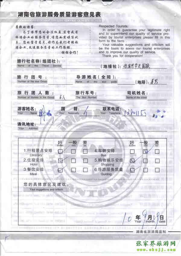 2010年9月18日明先生一行6位旅游質(zhì)量反饋