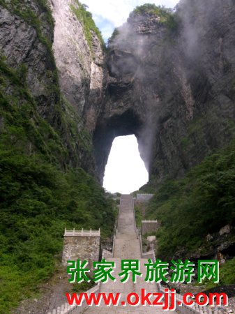 天門山古稱云夢(mèng)山,又名玉屏山。坐落在張家界市區(qū)以南10公里處。公元263年,因山壁崩塌而使山體上 部洞 開(kāi)一門,南北相通。三國(guó)時(shí)吳王孫休以為吉祥,賜名“天門山”。 天門洞,位于海拔1260多米的絕壁 之上,門洞高131.5米,寬37米。據(jù)地質(zhì)專家考證,門洞中央系東西巖層向 斜的交匯處,因擠壓而導(dǎo)致巖 石破碎崩塌,最終于263年形成門洞。天門山海拔1517.9米,因與山下市區(qū)相對(duì)高差達(dá)1300多米,故尤顯 偉岸挺拔,其天際線之美,堪為山的典型。